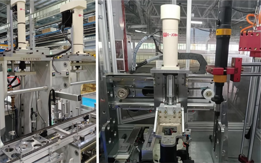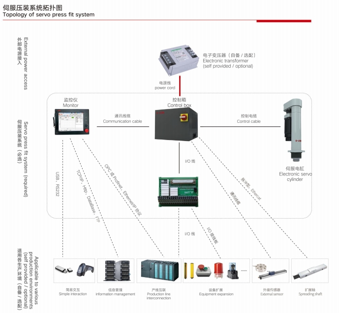 模塊化設(shè)計,本系統(tǒng)由伺服電缸、E-PreSs 工業(yè)軟件、控制箱、監(jiān)控儀和線纜模塊五部分織成??刂葡鋵崿F(xiàn)同服電知的運行控制和壓力數(shù)據(jù)采集,E-Press 工業(yè)軟件內(nèi)置標(biāo)準(zhǔn)數(shù)據(jù)庫,完成力位移的曲線實時顯示、商口判斷和包絡(luò)線檢測。測量數(shù)據(jù)和裝配結(jié)果可以與PLC、服務(wù)器交互,滿足過程數(shù)據(jù)的追湖要求。易久伺服壓裝系統(tǒng)可以非常靈活的集成在各種控制系統(tǒng)內(nèi),一臺監(jiān)控儀可以監(jiān)控多套伺服電缸同時工作。